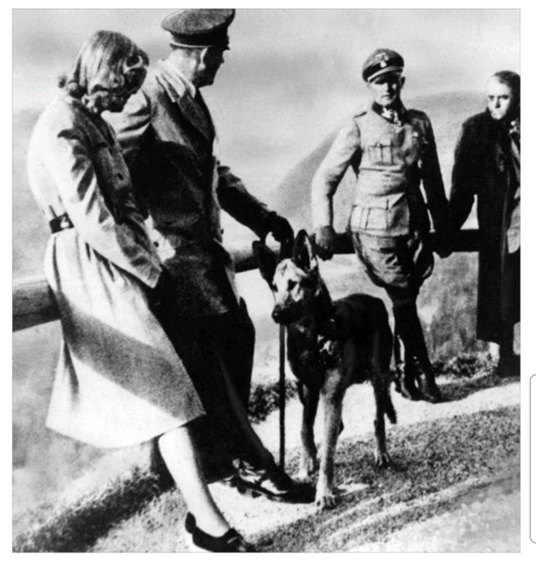 Từ trái sang phải, Eva Braun, Hitler, Blondi, Sepp Dietrich và Albert Speer.