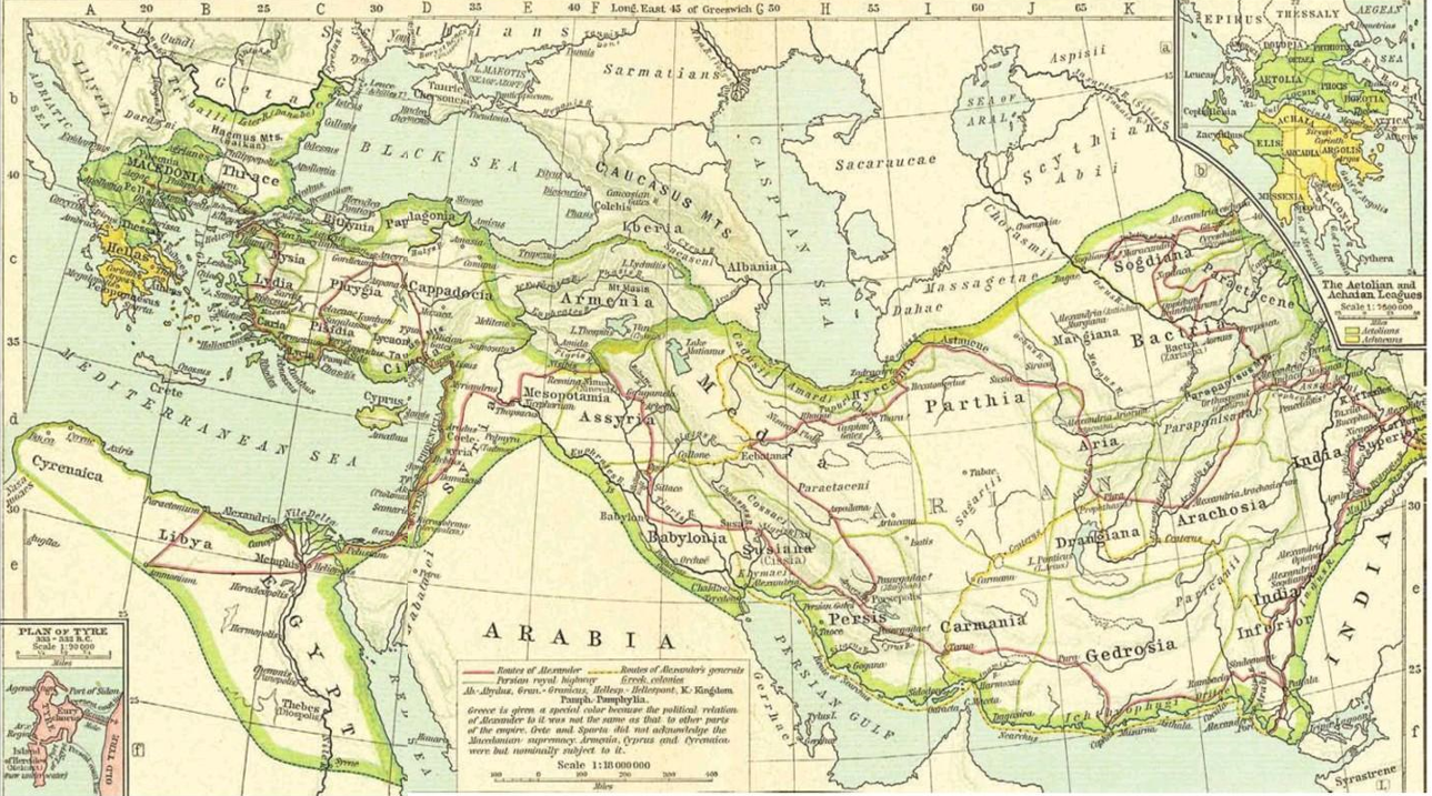 Các lộ trình hành quân của ALEXANDER Đại Đế được đánh dấu màu hồng trong bản đồ của đế chế Macedonia, từ năm 336 đến 323 TCN