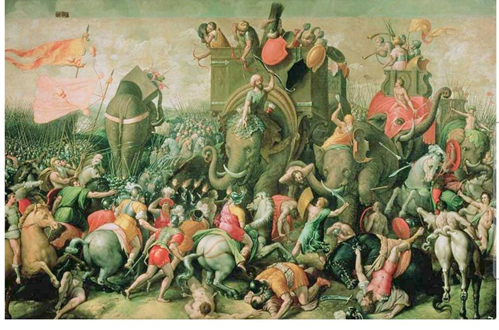 Người Carthage, dẫn đầu bởi các thớt voi chiến, đụng độ với quân đội La Mã trong trận chiến ZAMA, theo trí tưởng tượng của họa sĩ người Ý GIULIO ROMANO (1493-1546)