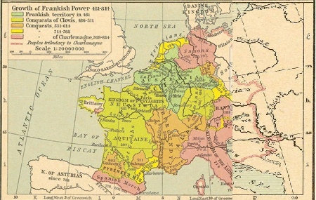 Bản đồ mô tả sự phát triển của quyền lực Frank dưới sự chinh phạt của Charles Martel 481-814