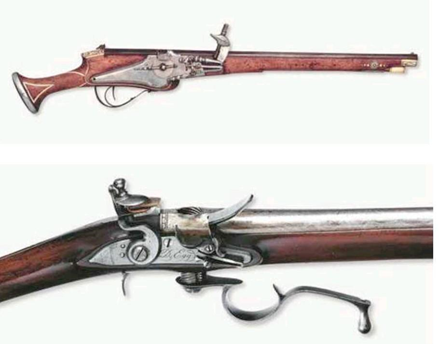 MỘT KHẨU SÚNG CÓ KHÓA BÁNH XE (PHÍA TRÊN) VÀ MỘT SÚNG KÍP (PHÍA DƯỚI).