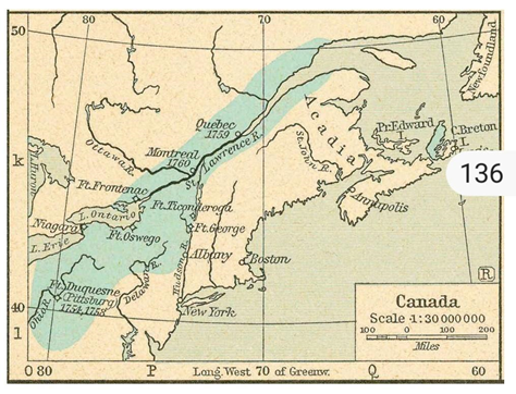 CHIẾN TRANH BẢY NĂM LÀ MỘT CUỘC XUNG ĐỘT TOÀN CẦU, Ở BẮC MỸ, TẬP TRUNG VÀO SÔNG ST. LAWRENCE VÀ OHIO Ở CÁC KHU VỰC ĐÔNG BẮC CỦA CANADA VÀ HOA KỲ NGÀY NAY, ĐƯỢC THỂ HIỆN TRÊN BẢN ĐỒ, TRẬN CHIẾN QUEBEC NĂM 1759 CUỐI CÙNG SẼ DẪN ĐẾN VIỆC MẤT TOÀN BỘ BẮC MỸ VÀO TAY ANH,