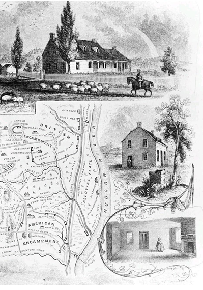 BẢN ĐỒ VỀ ĐỊA ĐIỂM DIỄN RA TRẬN SARATOGA, CÓ HÌNH ẢNH MINH HỌA NGÔI NHÀ NÔNG TRẠI ĐƯỢC SỬ DỤNG LÀM TRẠM CHỈ HUY CỦA QUÂN NỔI DẬY.