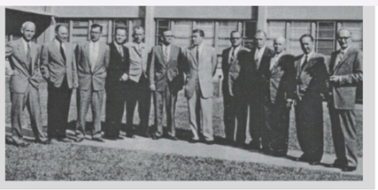 Von Braun và nhóm của ông tại Redstone Arsenal năm 1958. Trong ảnh từ trái sang phải là Ernst Stuhlinger. Helmut Hoelzer, Karl Heimburg, E. D. Geissler, E. W. Neubert, Walter Haeussermann, von Braun, W. A. Mrazek, Hans Hueter, Eberhard Rees, Kurt Debus và Hans Maus. (NASA)
