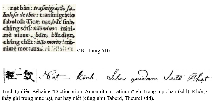 VBL trang 23 giải thích nạt bàn là biến mất (evanesco/L ~ desaparecer/Bồ so với tiếng Anh là disappear). VBL trang 510 ghi nạt bàn là sự luân hồi của Thích Ca, sau đó giải thích nạt là bất sinh, chẳng sống và bàn là bất diệt, chẳng chết. Có lẽ LM de Rhodes đã hiểu lầm tiếng Phạn Nát bàn – kiến thức về dạo Phật của Tây phương vẫn còn phôi thai vào TK 17 – nên giải thích theo cấu trúc Hán văn: đánh đồng chữ đầu nạt (nát) là bất sinh 不生 (chẳng sống – tiếng Việt TK 17) và chữ sau bàn là bất diệt 不滅 (chẳng chết – tiếng Việt TK 17). Thật ra, Nát/Niết bàn 涅槃 là kí âm của tiếng Phạn निर्वाण Nirvāṇa, tiếng Pali निब्बान Nibbāna. Nirvāṇa là một từ ghép của chữ nis (ra khỏi, mất) và vā (tắt) hay còn có những cách giải thích khác như vana là rừng, đường quanh co (td. pháp sư Huyền Trang) hàm ý sự mê muội/phiền não của nhân gian; do đó niết bàn là thoát khỏi sự phiền não …v.v… Là một khái niệm cốt lõi của đạo Phật, niết bàn từng có các dạng kí âm là 涅槃那, 涅盤那, 泥日, 泥洹, 泥畔, 泥盤那, 昵縛男 niết bàn na, niết bàn na, nê nhật, nê hoàn, nê bạn, nê bàn na, nật phược nam … Các dạng dịch/phiên nghĩa là 滅、滅度、寂滅、無為、解脫、自在、安樂、不生不滅 diệt、 diệt độ、 tịch diệt、 vô vi、 giải thoát、 tự tại、 an lạc、bất sinh bất diệt …v.v… Một điều đáng chú ý là cách đọc nạt bàn đã hiện diện vào TK 17, đến thời tự điển của Béhaine (1772/1773 – xem hình chụp bên dưới) và Taberd (1838 – chép lại Béhaine, đổi thứ tự chữ La Tinh không thay đổi nghĩa) vẫn còn duy trì dạng nạt ở Đàng Trong, ngay cả đến thời tự điển Theurel (1877 – chép lại hoàn toàn từ Taberd) ở Đàng Ngoài. Để ý nạt (nạt nộ) còn là nát (tục ngữ: đội xống nát nạ, ma nát – Việt Nam Tự điển/Hội Khai Trí Tiến Đức 1931). Thành ra nạt bàn còn có một dạng là nát bàn, và chữ Nôm nạt hay nát dùng niết HV 涅 cho ra cách dùng phổ thông hiện đại là niết bàn. Tác giả Génibrel[23] (1898, sđd) ghi chú thêm là các cách dùng nát (nạt nộ, dọa nạt, ~ nhát) và nạt bàn kinh là ở Đông Kinh (Tunkin, Đàng Ngoài).