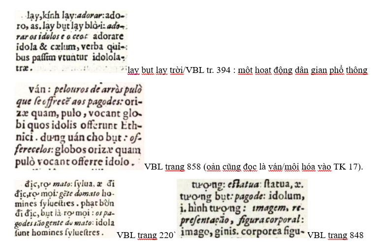 [15] Một chi tiết đáng chú ý là phần giải thích (VBL trang 394 – lạy, kính lạy) bằng tiếng Bồ Đào Nha dịch theo nguyên văn lạy bụt lạy trời; phần tiếng La Tinh cũng dịch theo nguyên văn nhưng lại thêm một nhận xét: đây là câu nói của người theo đạo Phật ở khắp nơi. Điều này còn cho thấy khả năng LM de Rhodes đã tra cứu hai tài liệu khác nhau (và có thể cập nhật lại) để soạn VBL – phần giới thiệu cuốn VBL (1651) cũng nhắc đến điều này.