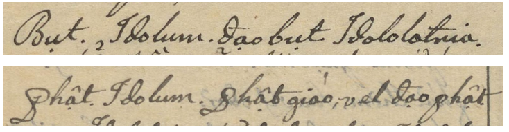 [13] Dịch là kính (cúng) các tượng thần (idolum/idolis tiếng La Tinh) – như theo các tác giả Đỗ Quang Chính/Hoàng Xuân Việt/Thanh Lãng sđd – thì không được chính xác cho lắm vì phạm trù nghĩa của idolum rất rộng: bụt (phật), bụt thần, hình bụt, tượng bụt (tượng phật) …v.v… Ngay cả phần tiếng Bồ, mục cột (phướn – VBL trang 134) lại ghi là cúng (kính) các thần/bụt (idolos) so với cúng (kính) bụt/phật (pagode) trang 609. Điều này phản ánh phần nào kiến thức của phương Tây về đạo Phật (‘đa thần’) vẫn còn phôi thai vào TK 17. Nhờ vào các tài liệu từ những giáo sĩ tiên phong của Dòng Tên như de Rhodes, Ricci mà phương Tây bắt đầu biết đến đạo Phật càng ngày càng chính xác và rõ ràng hơn.