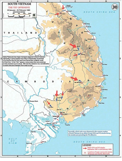 BẢN ĐỒ NÀY HIỂN THỊ CÁC ĐIỂM XÂM NHẬP CỦA QUÂN ĐỘI MIỀN BẮC VÀ VIỆT CỘNG (ĐÁNH DẤU BẰNG MŨI TÊN ĐỎ) KHI HỌ CHUẨN BỊ TẤN CÔNG TRONG CUỘC TẤN CÔNG TẾT MẬU THÂN .