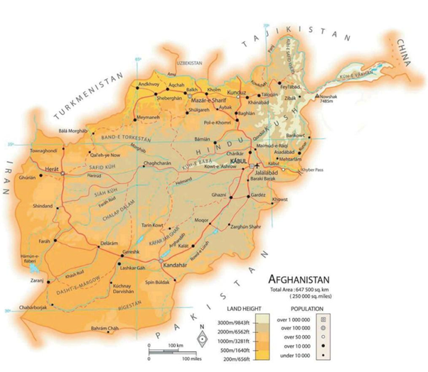 BẢN ĐỒ AFGHANISTAN NÀY CHO THẤY ĐỘ CAO CỦA ĐẤT NƯỚC, NƠI ĐỘ CAO CỦA NÚI LỞM CHỞM KHIẾN CHO VIỆC CHIẾN ĐẤU CHỐNG LẠI MUJAHIDEEN TRỞ NÊN KHÓ KHĂN HƠN NHIỀU.