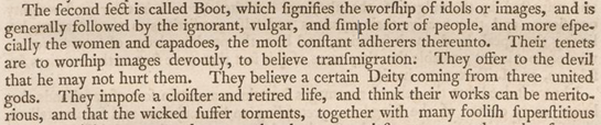 Tạm dịch/NCT: Tôn giáo thứ hai gọi là (đạo) bụt, thể hiện qua sự thờ cúng tượng hay ảnh liên hệ, được sùng bái trong giới (nhóm người) ngu ngơ, thô lỗ và mộc mạc (giản dị), và đặc biệt là giới phụ nữ và hoạn quan, đây là những người rất tôn thờ đạo bụt. Tín ngưỡng cốt lõi (của đạo bụt) là tôn thờ các ảnh bụt và tin vào luân hồi. Họ cúng kiến (dâng lễ vật) cho ma quỷ để không bị chúng hại. Họ tin vào khả năng thần linh đến từ ba vị Phật thống nhất. Họ sống một cuộc đời ẩn dật (xuất thế/NCT) và an nhàn/hưu trí (không làm việc kiếm tiền/buông bỏ lợi danh/NCT), và tin việc làm của mình có ảnh hưởng về sau (công đức – nhân quả/NCT), cũng như người ác sẽ gặp khổ đau và các dị đoan khờ dại khác …