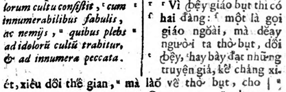 VBL ghi giáo và cho thí dụ đạo nhu (nho), đạo bụt, đạo đạo (phần La Tinh, mục giáo trang 281) không có trong phần tiếng Bồ Đào Nha, điều này lặp lại trong mục tam giáo (trang 717). Một lần nữa, phần La Tinh cắt nghĩa thêm so với phần tiếng Bồ, cho thấy khả năng LM de Rhodes đã soạn VBL dựa vào hai tài liệu khác nhau và cũng có thể cập nhật các mục này cho rõ ý. Giáo là từ Hán Việt 教, thường chỉ dùng chung với các từ HV khác như tôn giáo, Phật giáo, Hồi giáo, Khổng giáo, giáo dục, giáo sĩ … Tuy nhiên, vào TK 17, giáo có thể dùng một cách tự do (free morpheme) như trong PGTN: giáo độc, giáo bụt (~ đạo bụt, đạo Phật), giáo thứ hai (đạo Lão), giáo thứ ba (đạo Khổng). Một số từ HV có thể được dùng khá tự do (free morpheme) vào TK 17 như quốc, tiểu, trở, thậm, vô, cùng, tiền (trước), giáo (đạo) …v.v…