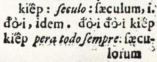 Kiếp xuất hiện bốn lần trong VBL ở các mục kiếp (trang 380-381), đời (trang 230), sau (kiếp sau[9], trang 682) và lô (tì lô – trang 417). Cũng như tiếng La Tinh saeculum (xem hình chụp bên dưới), nên nhắc ở đây là kiếp có phạm trù nghĩa khá rộng: một đời người, một trăm năm, một ngàn năm …