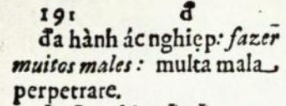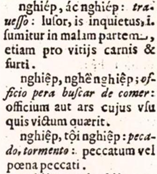 Định nghĩa của ác nghiệp phần tiếng Bồ Đào Nhà là travesso (hư nết, ngỗ nghịch), nhưng phần tiếng La Tinh giải thích thêm là kẻ chơi bời hàm ý xấu xa, liên hệ đến xác thịt hay trộm cắp – xem hình chụp bên trên. Điều này cho thấy – một lần nữa – LM de Rhodes đã dùng hai tài liệu (hai tác giả khác nhau) khi biên soạn VBL, vì nếu cùng một người viết thì hai phần tiếng Bồ và La Tinh thường phải giống nhau và cùng một ý; cũng có thể LM de Rhodes đã cập nhật (phần La Tinh) dựa vào các thông tin ghi chép cá nhân (hay một cộng tác viên nào đó). Trong các cách dùng trên, ác nghiệp và tội nghiệp có liên hệ mật thiết đến Phật giáo. Đầu tiên là xem lại chữ nghiệp HV 業 业 (thanh mẫu nghi 疑 vận mẫu nghiệp 業 nhập thanh, khai khẩu tam đẳng) có các cách đọc theo phiên thiết