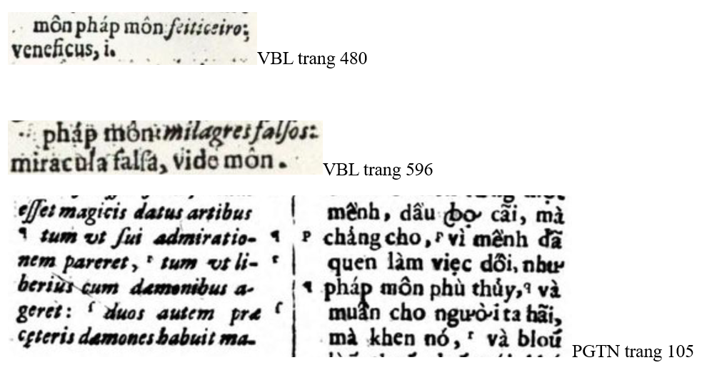 Phạm trù nghĩa khá rộng của pháp môn cho thấy khả năng lẫn lộn của cách dùng này, nhất là khi liên hệ đến tín ngưỡng dân gian (tôn giáo). Hiện tượng lẫn lộn này còn thể hiện trong phạm trù nghĩa của pháp sư 法師: có thể là đạo sĩ (phương sĩ) biết làm bùa phép trừ tà ma, hay có thể là một nhà sư hay một người tinh thông (~ biết) đạo Phật và có khả năng hướng dẫn chúng sinh tu hành. Tuy VBL không ghi danh từ pháp sư, nhưng xuất hiện trong các tự điển Béhaine/Taberd/Theurel. Sự lẫn lộn này thể hiện phần nào khi PGTN trang 105 (xem hình chụp bên trên) liệt kê pháp môn phù thủy trong phần bàn về đạo bụt (tam giáo là đạo nho, đạo bụt và đạo đạo/VBL). Phần bàn về đạo đạo (đạo Lão) xác định “… Giáo này thì thờ ma quỉ mà làm những phép giả[12], cùng chẳng có thờ Lão tử ấy sốt …”. Nét nghĩa phù thủy/bùa phép (venefiscus/L) xuất hiện thời VBL (1651) cho đến thời Béhaine (1772/1773), Taberd (1838), Theurel (1877), Vallot (1898) – cụ Huỳnh Tịnh Của ghi pháp môn là đạo thầy pháp (ĐNQATV/1895). Đến thời Génibrel (1898), Bonet (1899), Đào Duy Anh (1931), Gustave Hue (1937) thì giải thích khác hơn và gần với nghĩa pháp môn 法門 của đạo Phật như ngày nay, td. pháp môn tịnh độ, pháp môn thiền …v.v…