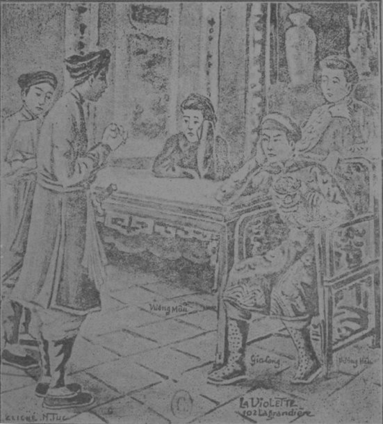 — Nàng hảy yên tâm, sự ấy ta đã lo liệu trước rồi, không sao phòng ngại, khuya nay chừng lối canh tư, chúng ta sẽ tìm qua xứ khác mà trú ngụ; nói rồi, kế thấy hai người mặc đồ đen ngoài cửa hăm hở bước vô, mổi người đều mặt vỏ phục gọn gàn, và bên lưng mang một cây gươm trường, tay cầm một ngọn roi ngựa, bước ngay tới trước người thanh-niên, rồi cung tay cúi đầu thi lể.