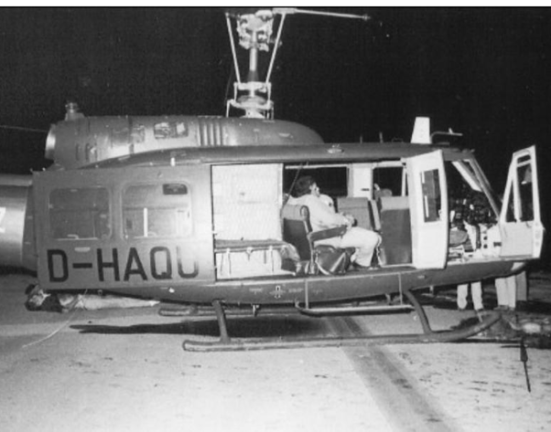 Đến 7:20 tối, trực thăng đã sẵn sàng và chờ để vận chuyển bọn khủng bố và con tin từ Làng Olympic đến Fürstenfeldbruck. Đậu trên một bãi đất rộng phía sau tòa nhà hành chính G-1 là hai chiếc trực thăng Bell UH-1D màu xanh lá cây đậm, hay còn gọi là “Iroquois”, những chiến mã đáng tin cậy từng được sử dụng để đưa đón hơn một chục lính Mỹ cùng lúc trên khắp chiến trường Việt Nam.