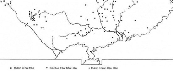 Hình 2 là vị trí các thành ở Lãnh-nam từ thời Tiền Hán (AD 2) tới Hậu Hán (AD 140), theo Hán thơ và Hậu Hán thơ.[6]