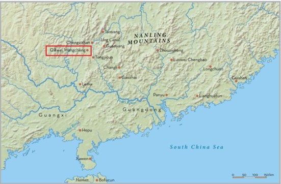 Lãnh-nam có 7 huyện và 55 thành, nay còn để lại nhiều di tích ở phía bắc đồng bằng sông Châu-giang; những thành này có lẽ đều xây theo kiểu ‘Thất-lý-vu vương-thành’ 七里圩王城 ở Hưng-an 興安 Quảng-tây: hình chữ nhựt, 4 tháp 4 góc, xung quanh là hào rộng 10–20 m, chứa nhiều khí giới, nhứt là mũi tên đồng (hình 3, ô màu đỏ).[7]
