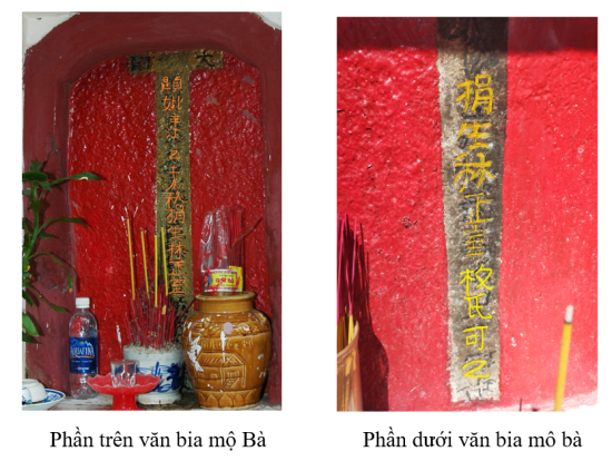 Trước tiên xét văn bia trên mộ Ông Bà: so với ảnh chụp văn bia và nội dung trong sách của Phạm Ngọc Hường “Văn bia Hán Nôm TP HCM khảo cứu và giới thiệu” cũng như báo chí và cộng đồng mạng công bố trước đây ta thấy có vài chữ cần chỉnh lại do sơn đi sơn lại nhiều lần.