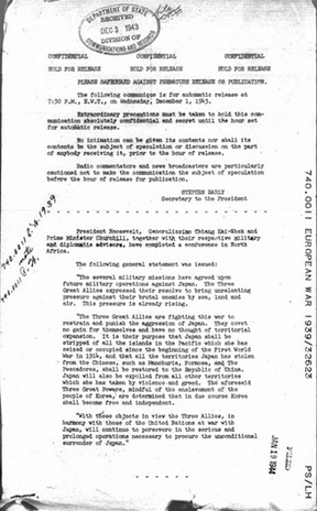 Cairo Communiqué, December 1, 1943 Ảnh tư liệu của Thư viện Quốc hội Nhật Bản: Japan National Diet Library, https://www.ndl.go.jp/constitution/e/ shiryo/01/002_46shoshi.html.