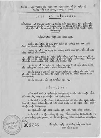 Ngày 13/7/1961, Sắc lệnh số 174 – NV của Tổng thống Việt Nam Cộng hòa đặt Quần đảo Hoàng Sa thuộc tỉnh Quảng Nam và thành lập tại quần đảo này một xã lấy tên là xã Ðịnh Hải trực thuộc quận Hòa Vang: “Quần đảo Hoàng Sa trước kia thuộc tỉnh Thừa Thiên, nay đặt thuộc tỉnh Quảng Nam” (Ðiều 1). Ðặt đơn vị hành chính xã bao gồm trọn quần đảo này được thành lập và lấy danh hiệu là xã Ðịnh Hải, trực thuộc quận Hòa Vang. Xã Ðịnh Hải dưới quyền một phái viên hành chính (Ðiều 2).