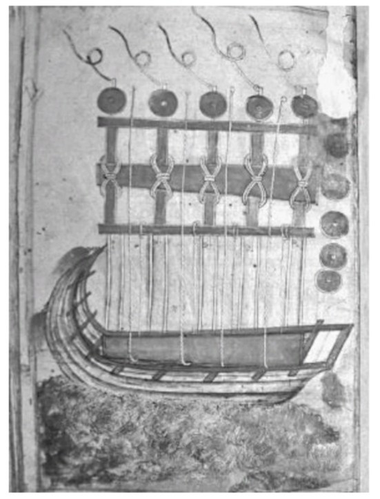Cột trụ vàng của Sultan Firoz Shah, từ một bản sao minh họa độc đáo của Sirat-i Firoz Shahi. Cột đá được chất lên xà lan trước khi được kéo xuống sông Yamuna. (Thư viện Công cộng Phương Đông Khuda Bakhsh, Patna)