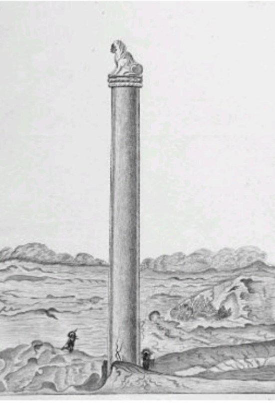 Chúng cao 27 cubits tính đến tận đầu cột, Trên đỉnh cột có một con sư tử, trông rất tự nhiên. Chu vi cột là 7 cubit, theo như tôi tự đo. Cột dường như nguyên khối. Tôi đã dùng rìu chặt nó nhiều lần, và bắn vài phát đạn mà nó không hề hấn gì. Hai cột này như thể có khắc một bản văn nào đó, mà tôi đã viết lại trên giấy rồi gửi đi cho Viện Hàn lâm Hindu ở Benares và một số học giả Tây Tạng; nhưng không một ai trong số họ có thể đọc hoặc hiểu một từ nào trong số đó… Những ký tự này dường như là một số ký tự Hy Lạp cổ đại.