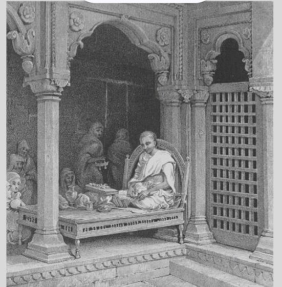 Một học giả Bà La Môn đang giảng kinh Puranas tại một ngôi đền Hindu ở Varanasi. Một bản in thạch bản của James Prinsep từ bản vẽ của ông được thực hiện vào những năm 1820 và đã được ông trình bày trong tác phẩm Benares Illustrated.