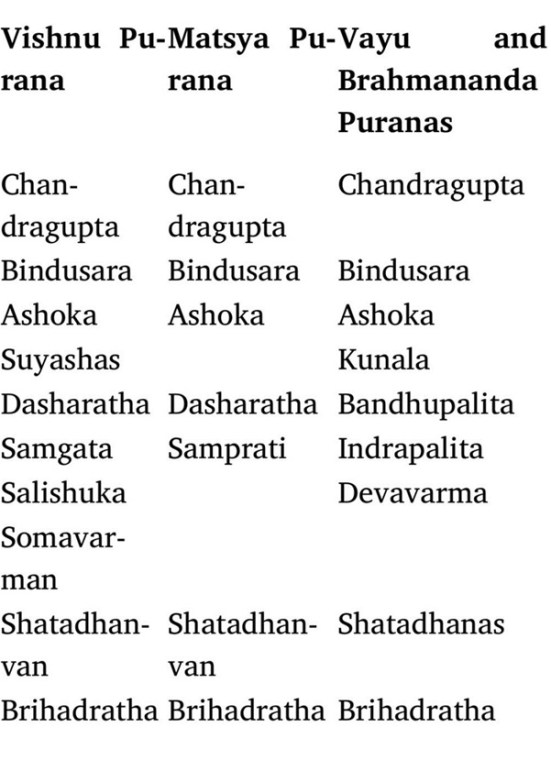 Vua Chandragupta đã thành lập triều đại Maurya, bao gồm 10 vị vua cùng nhau cai trị Magadha trong 137 năm. Chandragupta đã cai trị trong 24 năm, và con trai ông – được liệt kê với nhiều tên gọi khác nhau là Varisara, Vindusara hoặc Bindusara (nhưng sau này được gọi là Bindusara) cai trị trong 25 năm. Vị vua Maurya thứ ba là cháu trai của Chandragupta, Ashoka, đôi khi được gọi là Ashokavardhana, “Ashoka Đại đế”, người đã trị vì trong 36 hoặc 37 năm. Xét về lịch sử Bà-la-môn giáo, vị Ashoka này không mấy quan trọng. Các nhà biên soạn các Purana không đưa ra lời giải thích nào về lý do tại sao ông được gọi là “đại đế”, cũng không đề cập gì đến bất kỳ vị vua Maurya nào được liệt kê sau Ashoka. Thật vậy, (như các bảng phả hệ sau đây cho thấy), các nhà biên soạn Pusanas dường như không thể thống nhất về việc chính xác ai đã kế vị Ashoka lên ngôi vua Magadha, mà chỉ tìm thấy sự đồng thuận chung khi nói đến hai vị vua cuối cùng của triều đại Maurya: