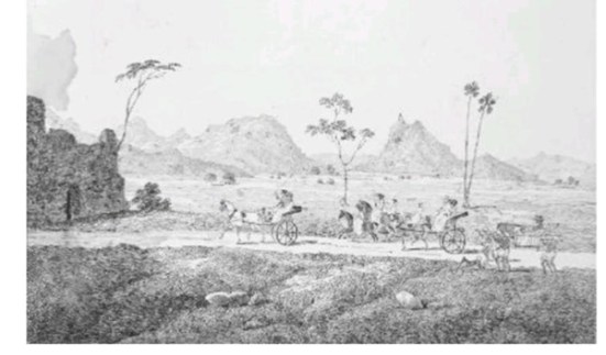 Một nhóm người châu Âu trên đường Gaya-Patna, với Đồi Barabar và Nagarjuni ở hậu cảnh. Một bức vẽ bằng bút mực của Sir Charles D’Oyly, niên đại 1825. (APAC, Thư viện Anh)