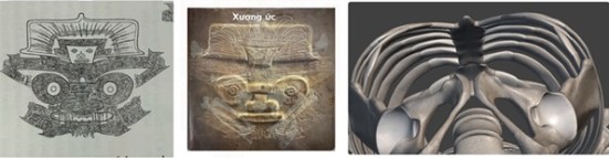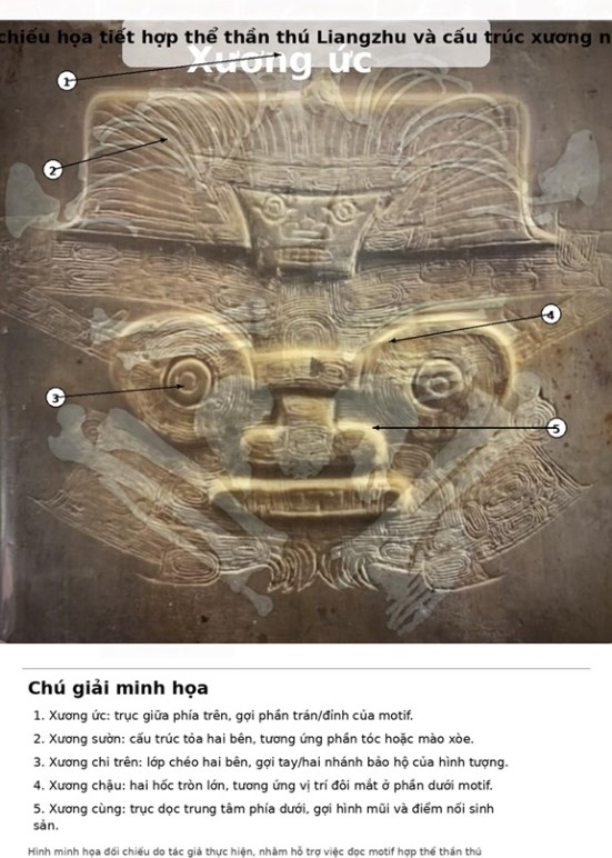 Hình 4. Đối chiếu motif mặt thần Liangzhu, hình chồng lớp, cấu trúc khung xương người