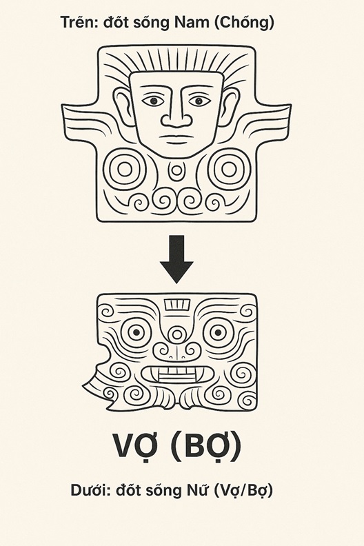 Trước hết là từ “vợ chồng”. Trong nhiều tiếng Mường và Việt cổ, từ “vợ” có liên hệ với động từ “bợ”, tức là nâng đỡ, hứng lấy từ phía dưới. Từ “chồng” lại mang nghĩa xếp lên, đặt lên trên. Khi thực hiện cải táng, người ta thường chồng đốt sống nam lên trên đốt sống nữ, tạo thành một khối thân thể hợp nhất. Hành vi này có thể là gốc gác biểu tượng của cặp đôi tổ tiên, nơi người vợ làm nền, và người chồng chồng lên. Như vậy, “vợ chồng” không chỉ là từ chỉ quan hệ hôn nhân, mà là khối sống, khối xương, khối phồn sinh đã được thể hiện qua nghi thức thiêng liêng.