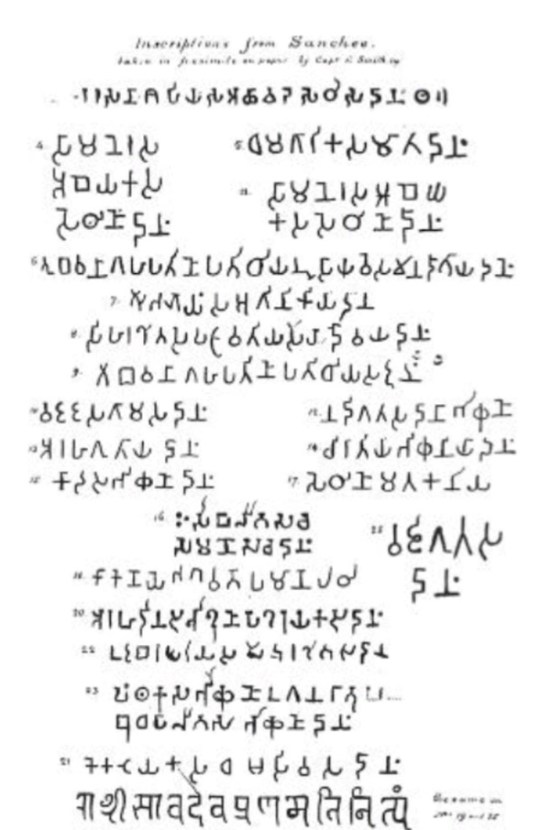 Những dòng chữ khắc ở Sanchi có hai loại. Hai dòng chữ khắc đầu tiên ghi chép việc cấp đất từ đầu triều đại Gupta vào thế kỷ thứ tư sau Công nguyên. Hai mươi ba dòng chữ khắc còn lại (xem hình minh họa ở đầu chương 8) bao gồm một số dòng chữ khắc ngắn hơn nhiều, bằng ký tự số 1, được tìm thấy trên các thanh ngang của vòng cột trụ bao quanh bảo tháp, hầu hết được khắc thô sơ, tương phản rõ rệt với các tác phẩm điêu khắc tinh xảo trang trí bốn cổng. Prinsep tuyên bố, những đoạn chữ thô sơ, có vẻ tầm thường này đã dạy chúng ta về bảng chữ cái và ngôn ngữ của những cột trụ cổ xưa và những dòng chữ khắc trên đá vốn là điều kỳ diệu đối với giới học giả kể từ thời Sir William Jones.