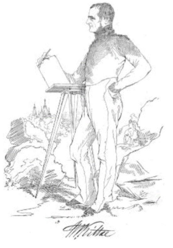 Trung úy Markham Kittoe, với tảng đá voi Ashokan ở Dhauli phía sau ông và những ngọn tháp đền thờ Bhubaneshwar ở phía xa. (Một bức vẽ của Colesworthy Grant được xuất bản trong Lithographic Sketches của ông, năm 1850)