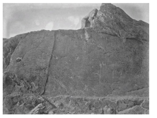 Chỉ dụ Đá Dhauli, với đầu voi Dhauli hiện ra lờ mờ trên mỏm đá phía trên. Bức ảnh này được chụp bởi Alexander Caddy năm 1895. (APAC, Thư viện Anh)
