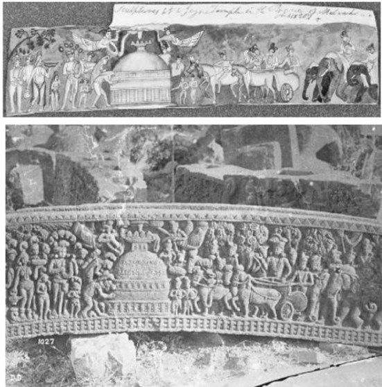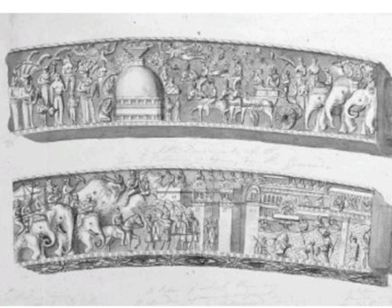 Một trong những độc giả đã phản hồi lời kêu gọi của Prinsep về việc minh họa các tác phẩm điêu khắc Sanchi là Đại úy William Murray, trợ lý của chỉ huy Lãnh thổ Saugor và Narbada. Ông đã gửi hai bức vẽ, cả hai đều được lấy từ các thanh ngang của Cổng Nam bị sụp đổ của Đại Bảo Tháp. Prinsep đã chọn để tái hiện trong JASB bức tranh nổi bật hơn trong hai bức, cho thấy một thành phố đang bị tấn công và một thứ trông giống như một vị vua cưỡi một con voi khổng lồ đang chỉ huy cuộc tấn công. Murray và Prinsep không hề biết rằng cả hai cảnh này đều là một phần của câu chuyện Ashoka mà mãi 80 năm sau mới được hiểu rõ. Bên dưới (phía trên) là bản vẽ lại cảnh trên và ảnh chụp (phía dưới) (Hội Hoàng gia Châu Á)